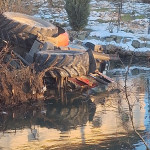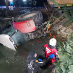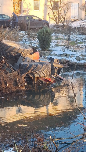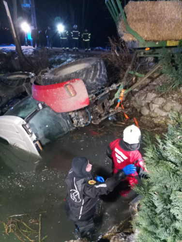 Nach dem Eintreffen am Einsatzort konnte glücklicherweise festgestellt werden, dass sich keine Personen im Traktor befanden. In einem ersten Schritt wurde die Einsatzstelle abgesichert und der noch angekoppelte Anhänger gegen ein mögliches Verrutschen gesichert. Parallel dazu errichteten wir umgehend eine provisorische Ölsperre auf dem Gewässer, um ein Ausbreiten eventuell austretender Betriebsmittel zu verhindern.